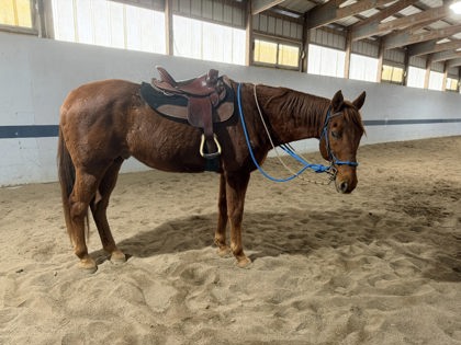 "Lazarus" is a 2000 chestnut 16hh Thoroughbred gelding who came to us to find a soft place to land when his owner was moving. He was once a racehorse but left the track a long time ago. So far he is a mannerly and friendly fellow. He does have a very faded lip tattoo, but it seems to be illegible.