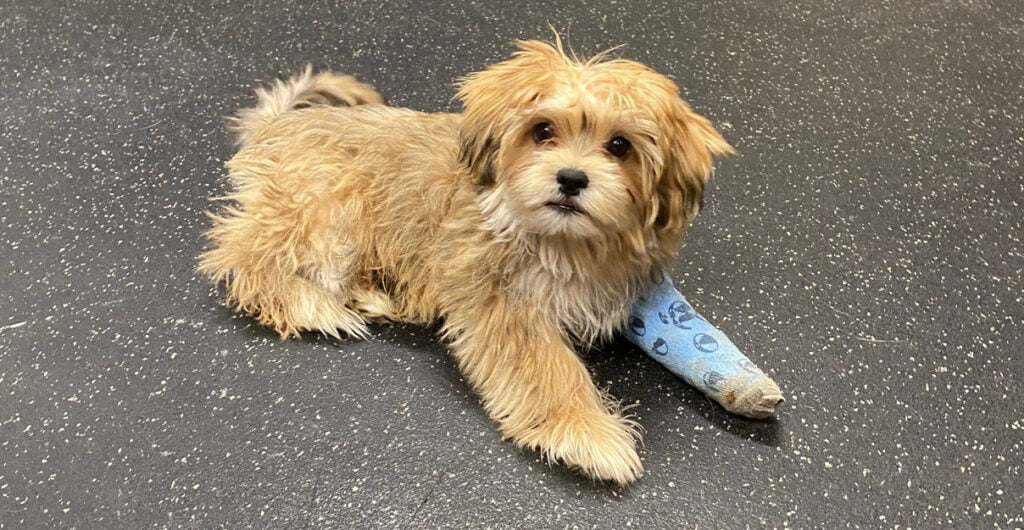 This three-month-old puppy recently came to the Kentucky Humane Society in need of urgent medical care after a Good Samaritan found him badly injured by the side of the road. The poor Shih Tzu’s tiny front left leg was badly broken and he wasn’t able to walk. X-rays revealed that had a terrible fracture at his elbow joint and the prognosis was not good. Kirby, as we have named him, will need to have his leg amputated. Our vet team put a splint on his broken leg and is giving him medication to relieve his pain until he is ready for surgery. This sweet boy has quickly stolen all of our hearts at KHS! He loves being held by the staff and volunteers, and has the cutest, most playful and happy personality!