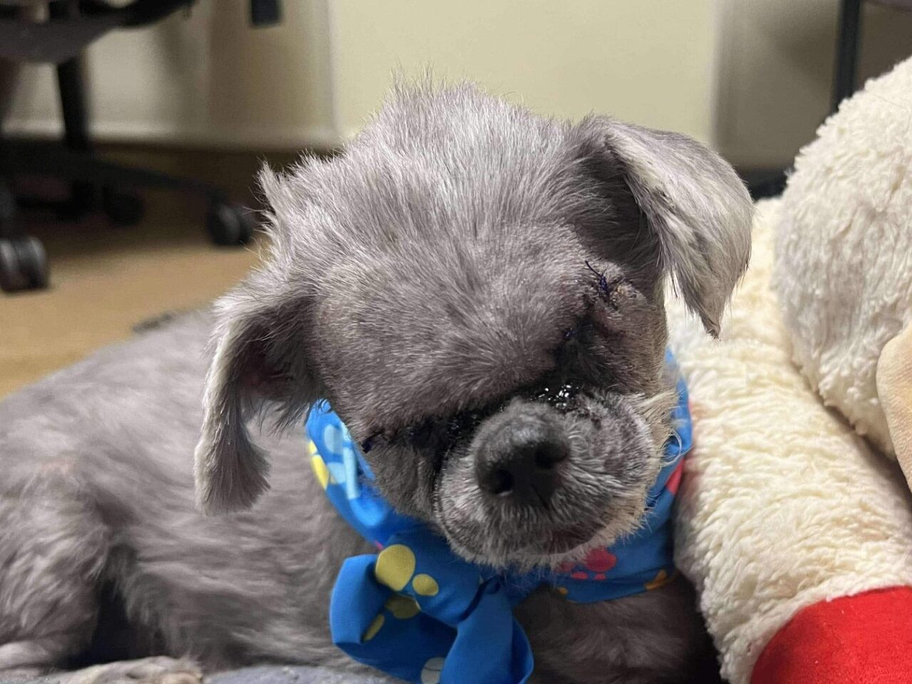 Earlier this week we introduced you to Harold, a seven-year-old Shih Tzu who came to KHS in heartbreaking shape after our friends at Louisville Metro Animal Services rescued him from a life on the streets. This poor boy’s eyes were swollen and protruding from the sockets. He had so much scarring on his corneas that he was permanently blind and in obvious pain. Our veterinary team provided him with antibiotics, pain medication and medicated eyedrops to ease his discomfort, but knew that surgery was the only way to guarantee sweet Harold a full recovery.