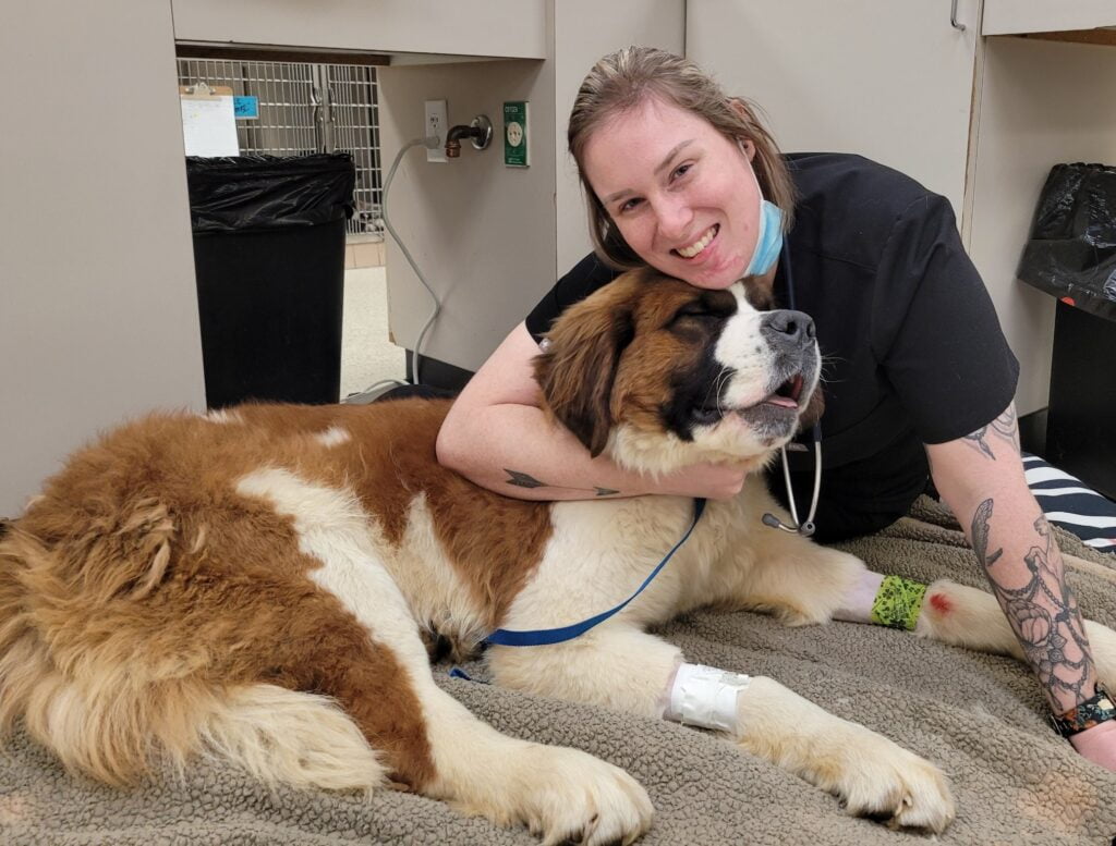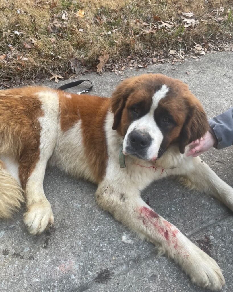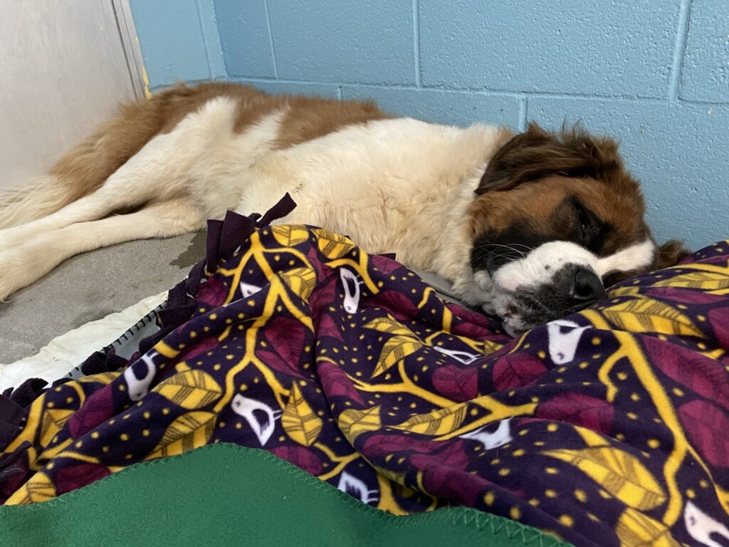 The dog, whom we’ve named Ludwig van Beethoven (Ludwig for short), was in a lot of pain upon arriving at KHS and had a very difficult time walking. Being a St. Bernard mix weighing close to 100 pounds, we immediately sent Ludwig to a specialist to see what damage the 20 foot fall did to his poor body.
