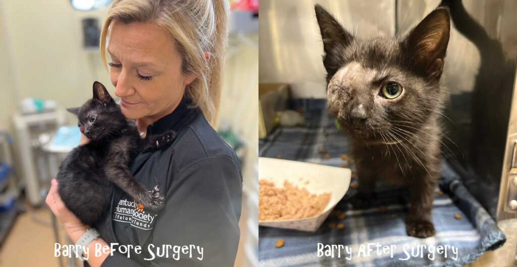 Yesterday, the Kentucky Humane Society took in six animals from Louisville Metro Animal Services, including five large dogs and one very tiny, injured kitten named Barry. The 2-month-old’s right eye was so infected that the globe had ruptured and Barry was in unimaginable pain and distress! As always, our vet team acted quickly to put a stop to his suffering. This morning, we performed an eye enucleation surgery to remove the injured eye. Everyone at KHS is so relieved that we were able to treat Barry and that he is no longer in pain. Barry still has a long road ahead of him, and we will continue to give him the care he needs to fully recover. We can only do this because of supporters like you.