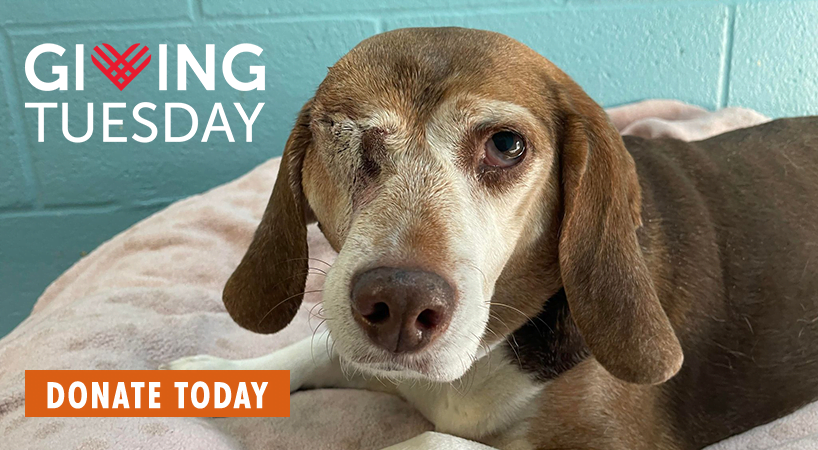 Your Giving Tuesday gift will help animals like Copper. This sweet senior beagle came to the shelter with a heart murmur and an eye that was so irritated it needed to be removed. Supporters like you helped make Copper’s lifesaving medical care and eye surgery possible. He is now recovering and will be available to find his forever home soon. There are still so many animals like Copper who need your help.