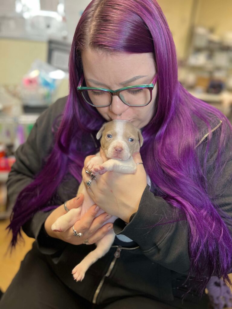 Peggy is only two weeks old and has already been through far too much. When she was born, her mom’s umbilical cord was wrapped around Peggy’s tiny right back foot, causing it to lose blood supply. Her foot quickly turned necrotic, meaning the tissue died and could not heal, so she was rushed to our Sam Swope Pet Treatment and Lifesaving Center for immediate medical attention. Our veterinary team was shocked to see such a small puppy with this severe of an injury, but we promised to be there for her every step of the way.
