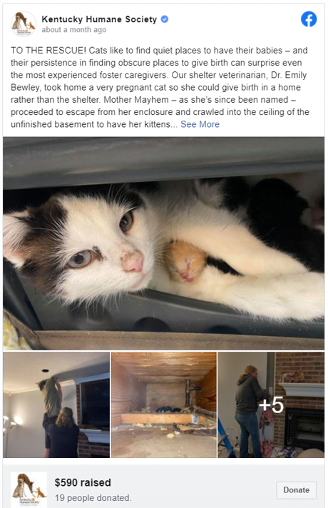 Our shelter veterinarian, Dr. Emily Bewley, took home a very pregnant cat so she could give birth in a home rather than the shelter. Mother Mayhem – as she’s since been named – proceeded to escape from her enclosure and crawled into the ceiling of the unfinished basement to have her kittens.
