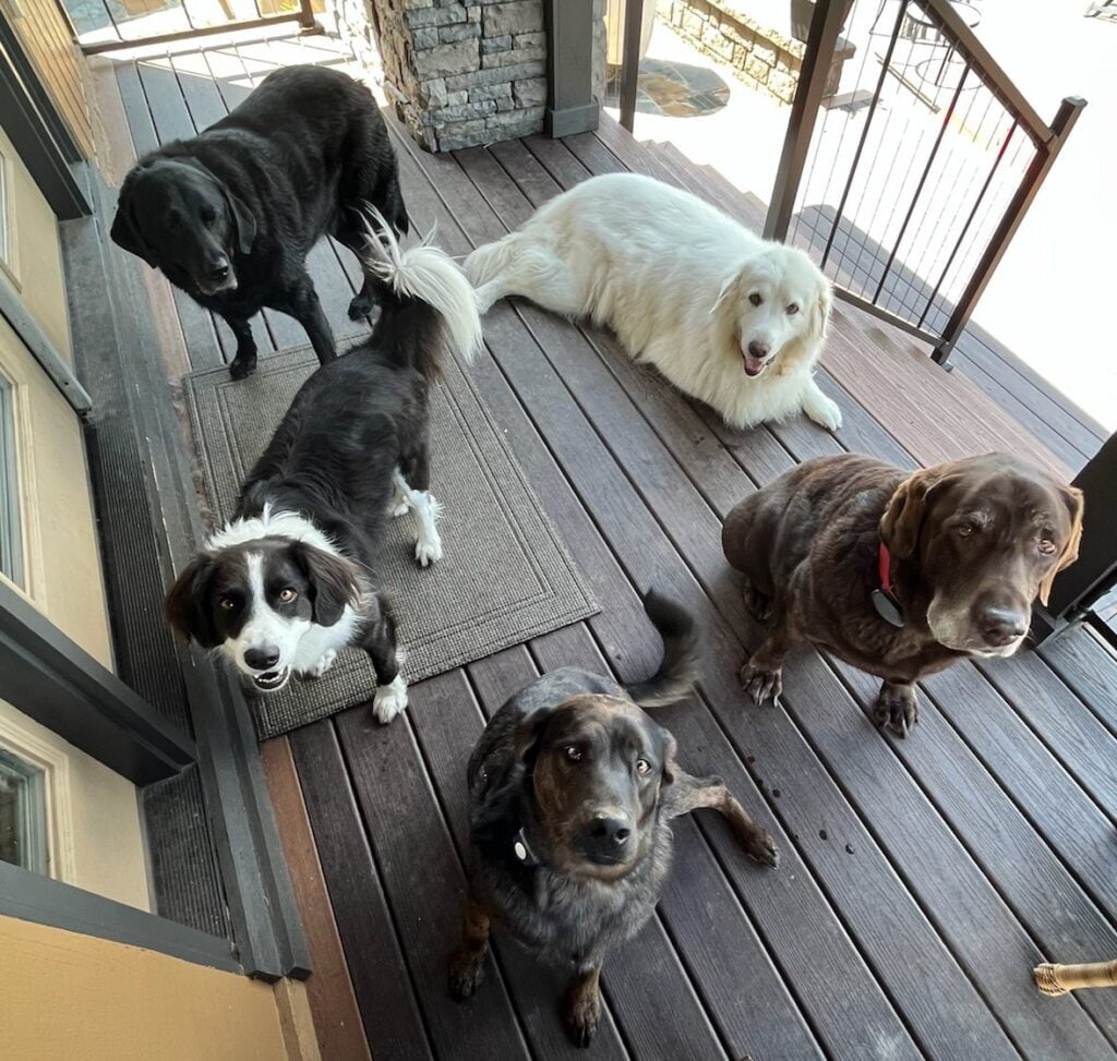 Denny and Susan Crum’s five dogs (clockwise): Bitty (white sheepdog), Luke, Zeke, Theo and Buddy