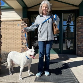 Figgy was rescued earlier this year by KHS staff. She was on the verge of hypothermia and sepsis when a local postal worker noticed her on his delivery route. After some well-deserved rest and tender loving care, Figgy was cleared for adoption and started her search for a forever home! It didn’t take long before her new family came along and fell in love with Figgy’s laid-back, loving personality. They made it official this week, and now this sweet dog can put her pain behind her.