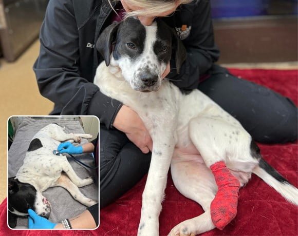 Early this week, a 12-month-old puppy arrived at our Sam Swope Pet Treatment and Lifesaving Center with a shocking degloving injury to her back left foot. The poor puppy, who we’ve named Bonnie, has exposed bone where a pup’s paw should be. Unsure of exactly how this gruesome injury occurred, our veterinary team leaped into action to provide Bonnie with pain medication and antibiotics to help ease her pain and prevent infection from setting in.We are doing everything we can to ensure Bonnie heals from the trauma and pain she’s endured. While we hope to avoid amputation surgery, it may be the only to guarantee a full recovery. She is under close observation so our vet team can determine the best way to move forward. Thankfully, Bonnie is exactly where she needs to be: here, getting the tender loving care she deserves. We will keep you updated on her progress, but in the meantime, we ask you to please consider donating in her honor. Your gift will impact vulnerable animals like Bonnie who are in desperate need of our TLC. Thank you for caring!