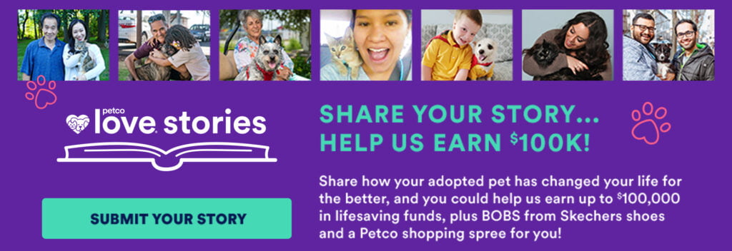 Petco Love, in partnership with BOBS from Skechers, is celebrating the love we share for our adopted pets! By submitting their Love Story, pet owners can help the shelters they adopted from win lifesaving funds. Finalists will receive a Petco shopping spree up to $1,000 and BOBS from Skechers shoes, and the organization they adopted from will receive a grant award up to $100,000!
