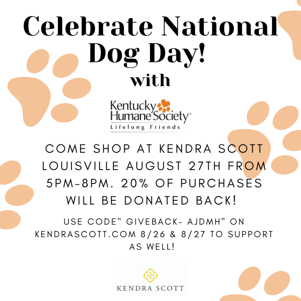 Celebrate National Dog Day at Kendra Scott! Come shop at Kendra Scott in person, located at 900 Shelbyville Rd b-10, Louisville, KY 40222, on August 27 from 5-8 pm. 20% of purchases made on this day will be donated to the animals of the Kentucky Humane Society! KHS will be there with adorable puppies that you can play with as you shop.