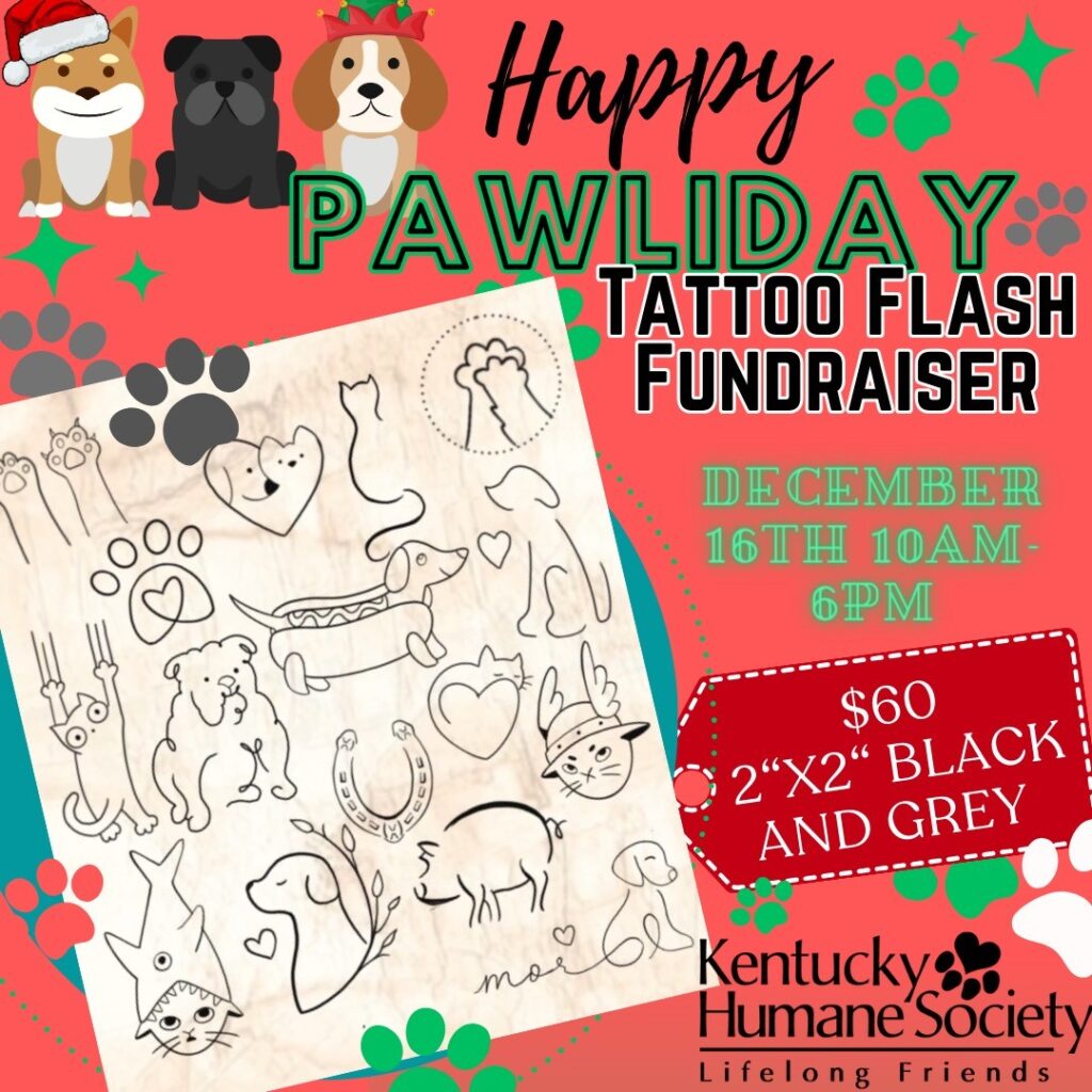 This holiday season, make a difference for our sweet shelter animals! Tats by Bubbles is hosting a charity flash event and ALL proceeds will be donated to the Kentucky Humane Society. No appointments needed – it’s first come, first serve.