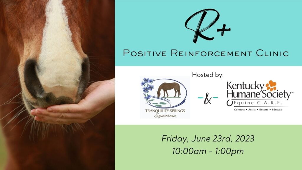 Positive reinforcement techniques can yield great results if the techniques are applied correctly and thoughtfully. The R+ Positive Reinforcement Clinic, presented by the Kentucky Humane Society Equine C.A.R.E. Team and Tranquility Springs Equestrian, will balance live demonstrations and hands-on practice for anyone interested in learning about how positive reinforcement can be used to solve basic equine management problems and refine troublesome behaviors.