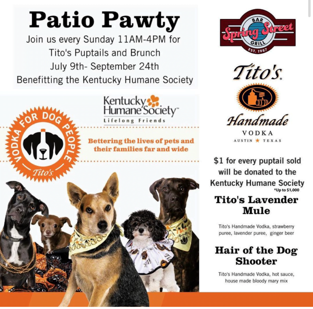 Puptails and brunch for you and a tail waggin’ good time for your pup? Sounds like paw-fection to us! Join our friends at Spring Street Bar & Grill for a Patio Pawty EVERY SUNDAY through September 24! This Sunday, September 3, KHS will have adorable puppies on-site for you to snuggle! Enjoy brunch and delicious pup-tails made with Tito’s Handmade Vodka, all while supporting KHS’ lifesaving work for dogs, cats and horses. $1 of each puptail sold will benefit our sweet shelter pets; so mark your calendars, call your friends, leash up your pup and meet us at the patio! We can’t wait to see you there!