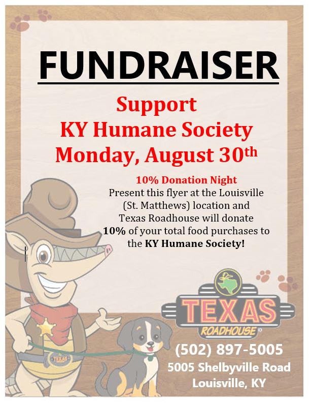 At the St. Matthews location, show your server the flier below and Texas Roadhouse will donate 10% of your total food purchases will be donated to the Kentucky Humane Society. Valid at the St. Matthews Texas Road House located at 5005 Shelbyville Rd, Louisville.